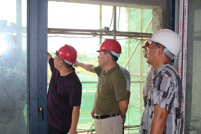 在正在装修的样板间内,董事长一行对橱柜、地板等每个细节一一进行检查,并听取现场工程人员说明。因上周超强台风“尤特”对工程现场造成了部分损坏,董事长特别交代日后务必加强防范。为了能将房子早日交到业主手中,也对工程部做出要求:加快工程进度的同时,工程质量也必须严格把关!在工作过程中遇到什么困难,及时向上反映,公司会作为强有力的后盾,给予支持。