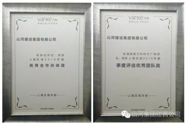 山河集团喜获万科上海区域年度“优秀合作伙伴奖”和“季度评估优秀团队奖”两项殊荣,这也是南昌万科总承包单位近年来首次获此殊荣。