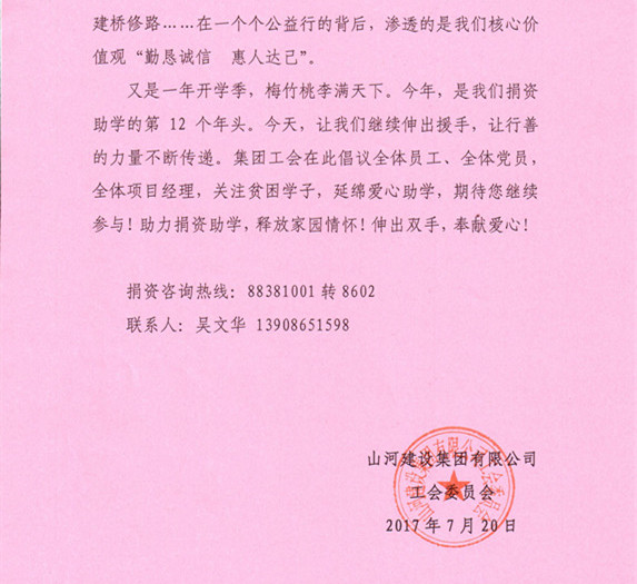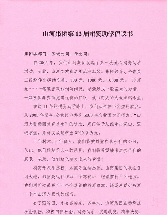 山河集团第12届捐资助学倡议书!