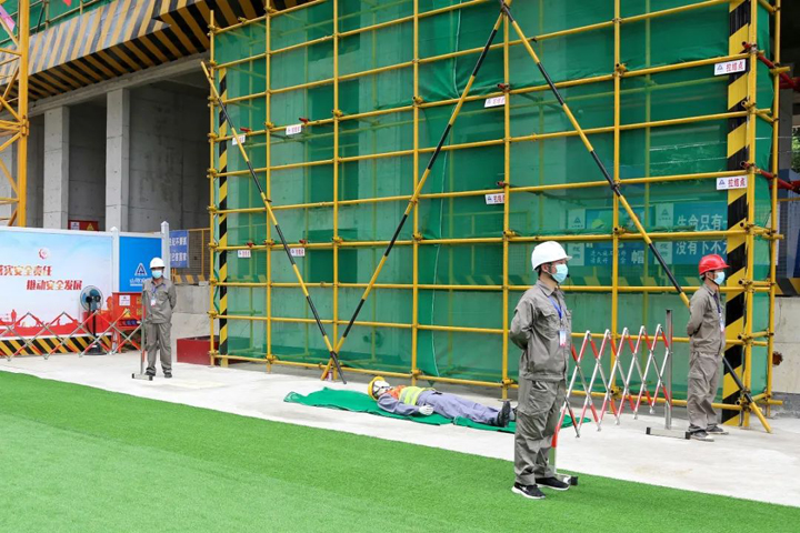 项目经理发出指令,立即启动应急救援预案,同时拨打120求助,并向上级单位报告。警戒隔离组、抢险救援组、医疗救护组先后进入事发区域,拉设警戒区,检查伤者情况并进行初步包扎处理,撤离作业人员,将伤者抬上担架送上救护车,一系列行动有力有序,“受伤工人”得到了及时救治。