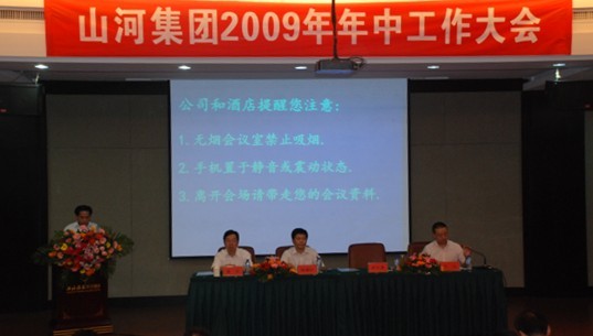 2009年9月19日-20日,山河集团2009年年中大会在江西庐山西海度假村会议中心召开。集团公司董事长程理财、党委书记舒先厚、总经理黄林以及各党委副书记、副总经理、三总师和集团公司办公人员、区域公司及子公司主要负责人、集团公司项目经理近两百人齐聚一堂,共商山河发展大计。
